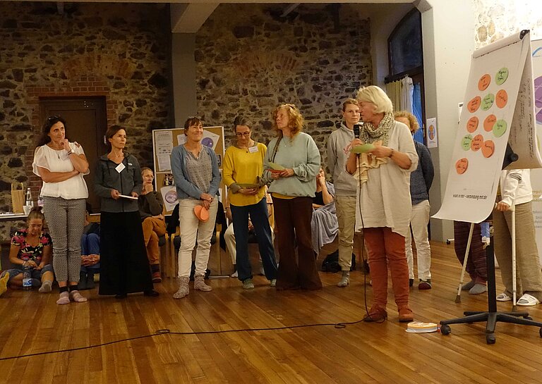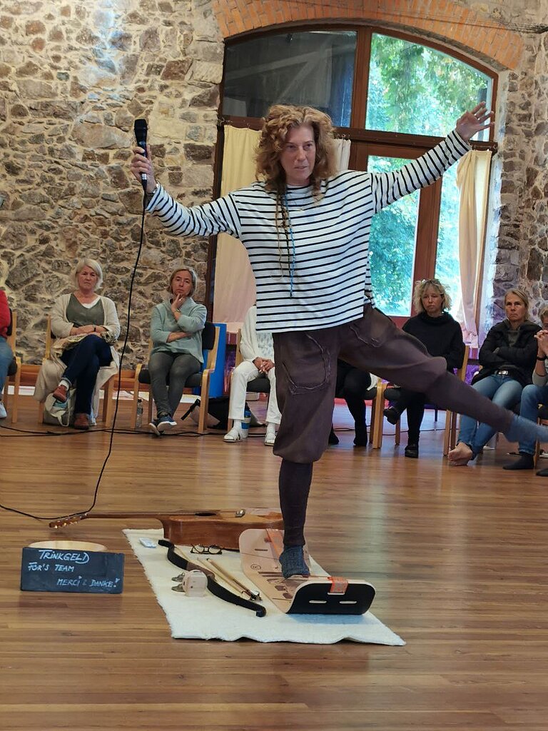 Nach einem redeintensiven Samstag hat uns mit Freude und Begeisterung Marie Vogelei die Methode Aikishintaiso nahegebracht. Ihr Workshop hieß Bewegung, Aufrichtung und Ethik. Die Bewegungen und Haltungen waren ungewohnt und erstmal auch anstrengend für einige. Das faszinierende war die zentrierende Körperspannung durch die sehr genaue Arbeit am Detail, die durch Gewichtsverlagerung beginnend von den Füßen sich durch den Körper bis zum Kopf erstreckte. Alles, was bisher am Wochenende vorangegangen war, habe laut Marie den Raum und den Inhalt schon gut vorbereitet. Wir konnten gemeinsam auf die Zentrierung, die gute Verbundenheit mit der Erde, die Bereitung eines geschützten Raumes und das Klar-Bei-Sich-Selbst-Sein und -Bleiben Bezug nehmen. Viele meldeten an Marie, dass Übungen auf verschiedene Weise gutgetan haben: Ich fühlte mich ganz klar zentriert...Ich war so leicht und beschwingt... Mein Knie/mein Rücken tat weniger weh... Ich konnte meine verletzte Schulter bewegen... Ich bin endlich mal mit warmen Füßen eingeschlafen.